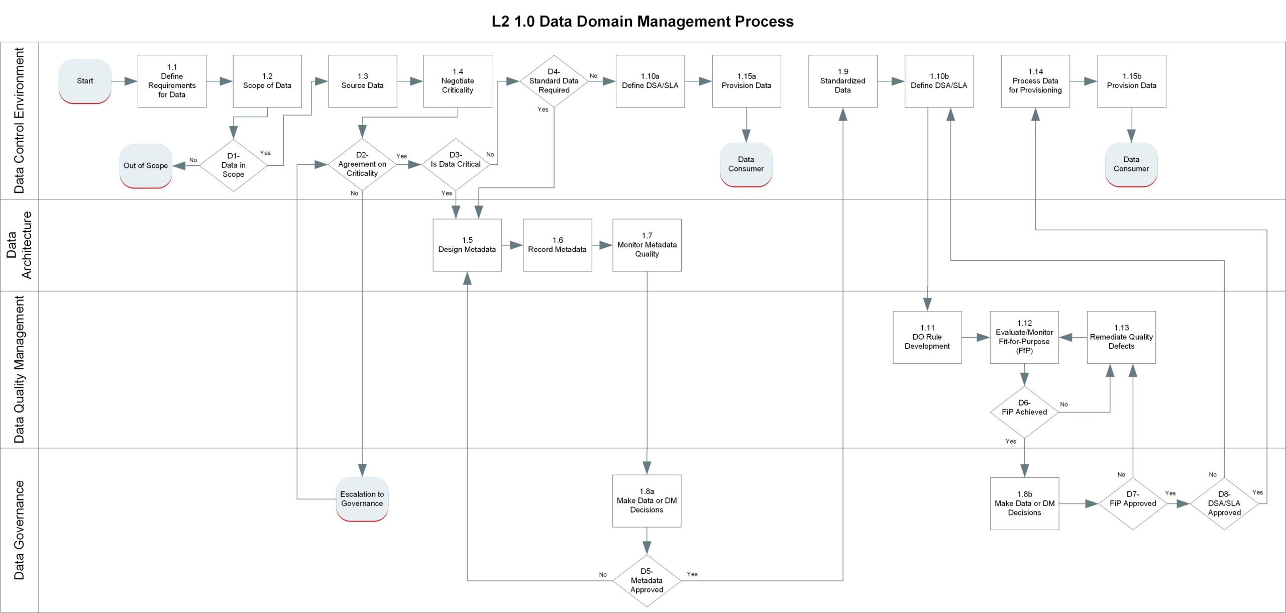 | D7 | Data Governance | Fit-for-purpose approved? ● If yes, move to D6 to approve DSA / SLA. ● If no, return to 1.11 to close identified gaps. |